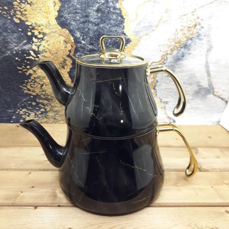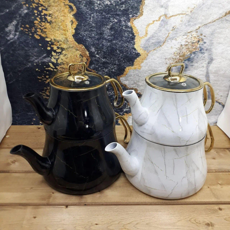 کتری قوری ماربل بریونی محصول ترکیه کیفیت درجه یک گرانیت 6لایه دسته های استیل با آبکاری PVDرنگ ثابت بدون داغ شدن دسته ها روی شعله درب جداگانه کتری قابل استفاده روی انواع اجاق ها ✔️BPA FREE جنس بدنه گرانیت 6لایه حجم کتری : 2\u002F2 لیتری حجم قوری: 1\u002F2 لیتری
