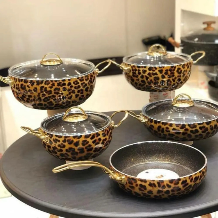 سرویس قابلمه پلنگی 9پارچه گرانیتی محصول ترکیه 🇹🇷 👈 قابلمه 9 پارچه سایز قابلمه ها 20 - 24 - 28 تابه دو دسته دربدار سایز 26 تابه تک دسته بدون درب سایز 26