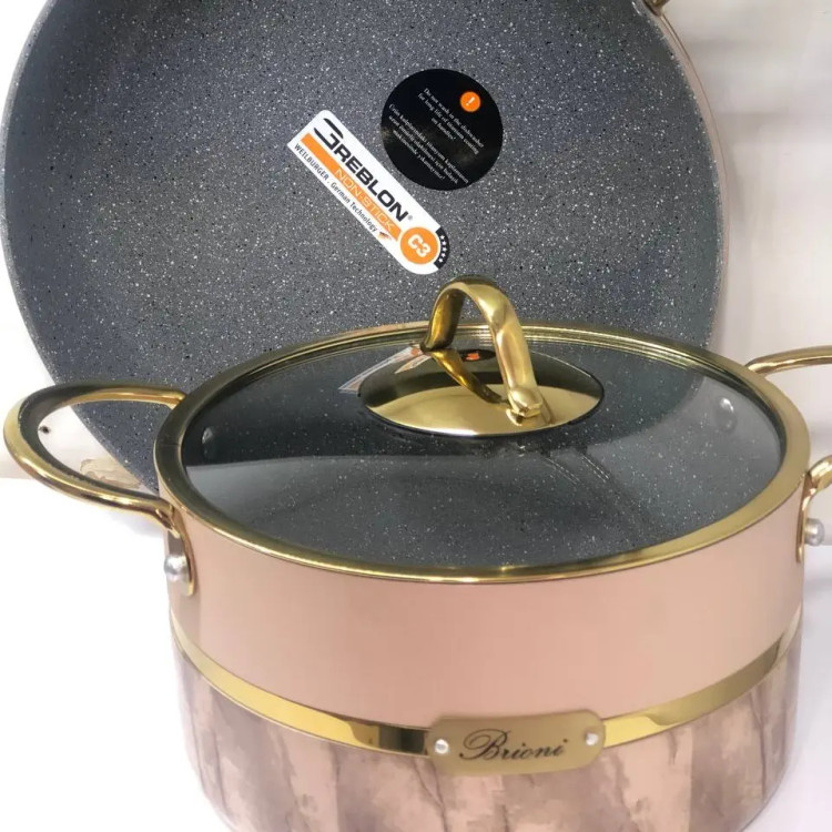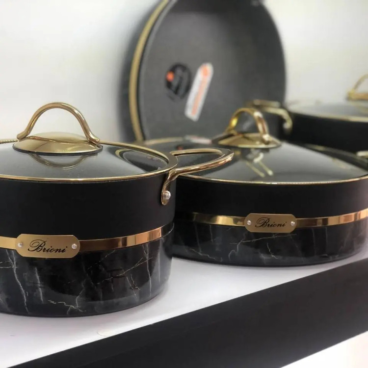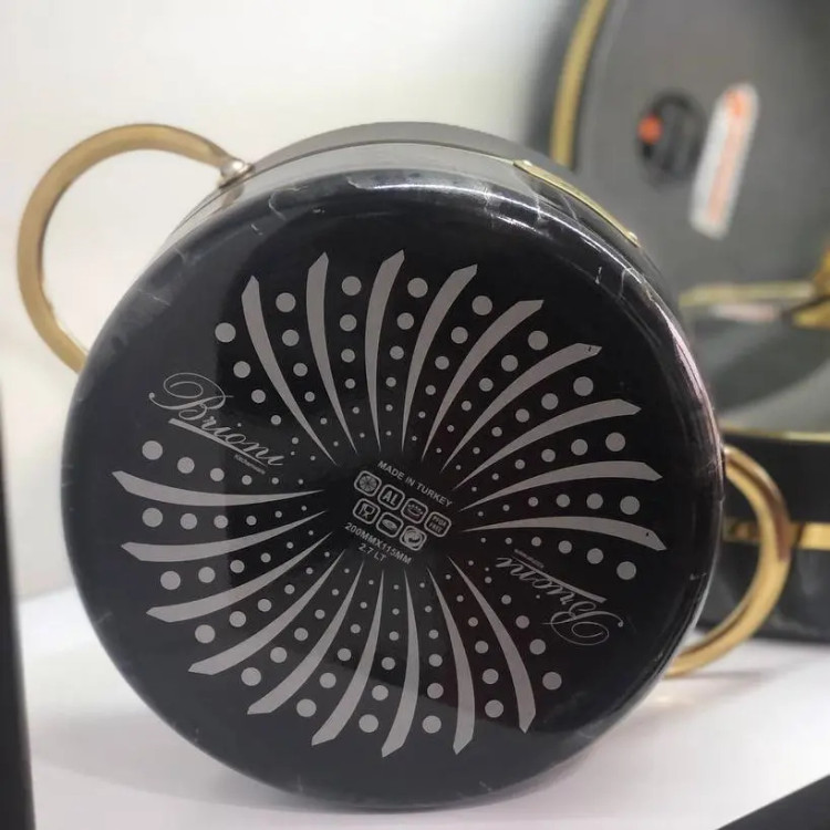 سرویس قابلمه بریونی اصلی محصول ترکیه برند بریونی رنگ ثابت جنس گرانیت پنج لایه موجود در دو رنگ کرم و مشکی بسیار شیک و خاص 9 پارچه سه عدد قابلمه در سایز های 20 ، 24 و 28 دو عدد تابه تک دسته و دو دسته سایز 28